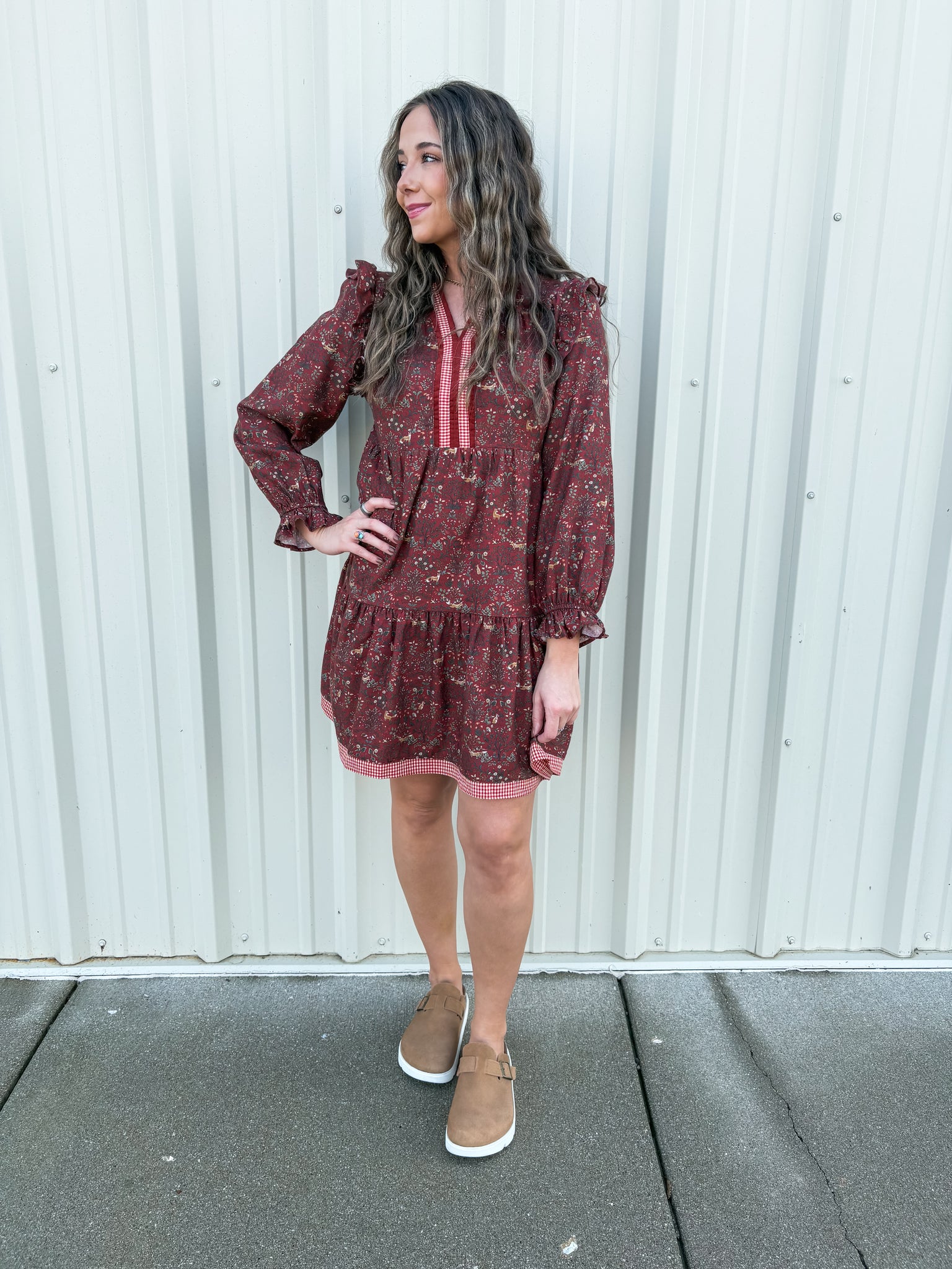 Vintage Woodland Print Tiered Dress with Ruffled Shoulders and Accent Fabric Details