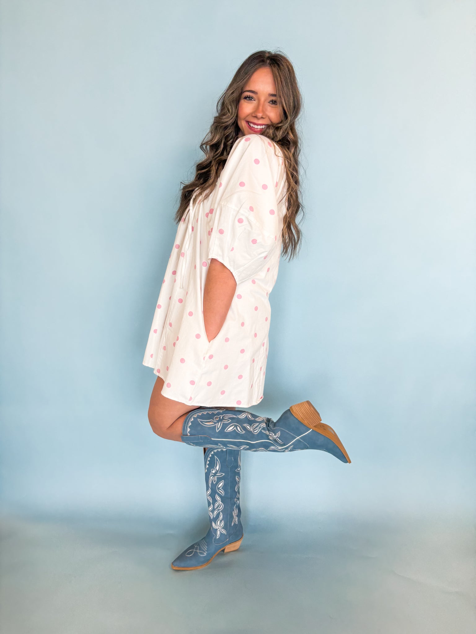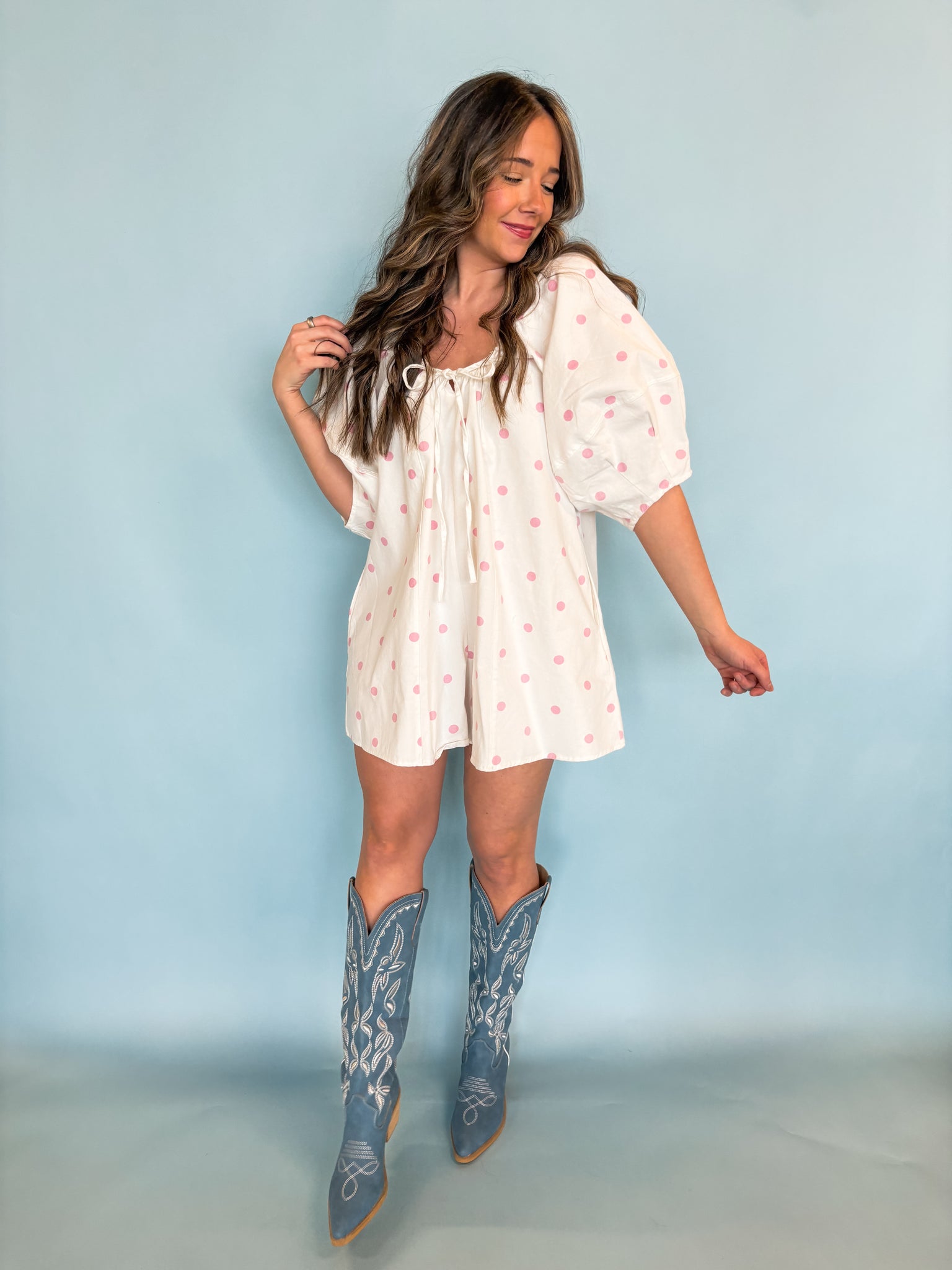 Bring a touch of whimsical charm to your boutique with this delightful romper, featuring airy bubble sleeves and sweet pink polka dots on a breezy, oversized silhouette for an effortlessly playful look.