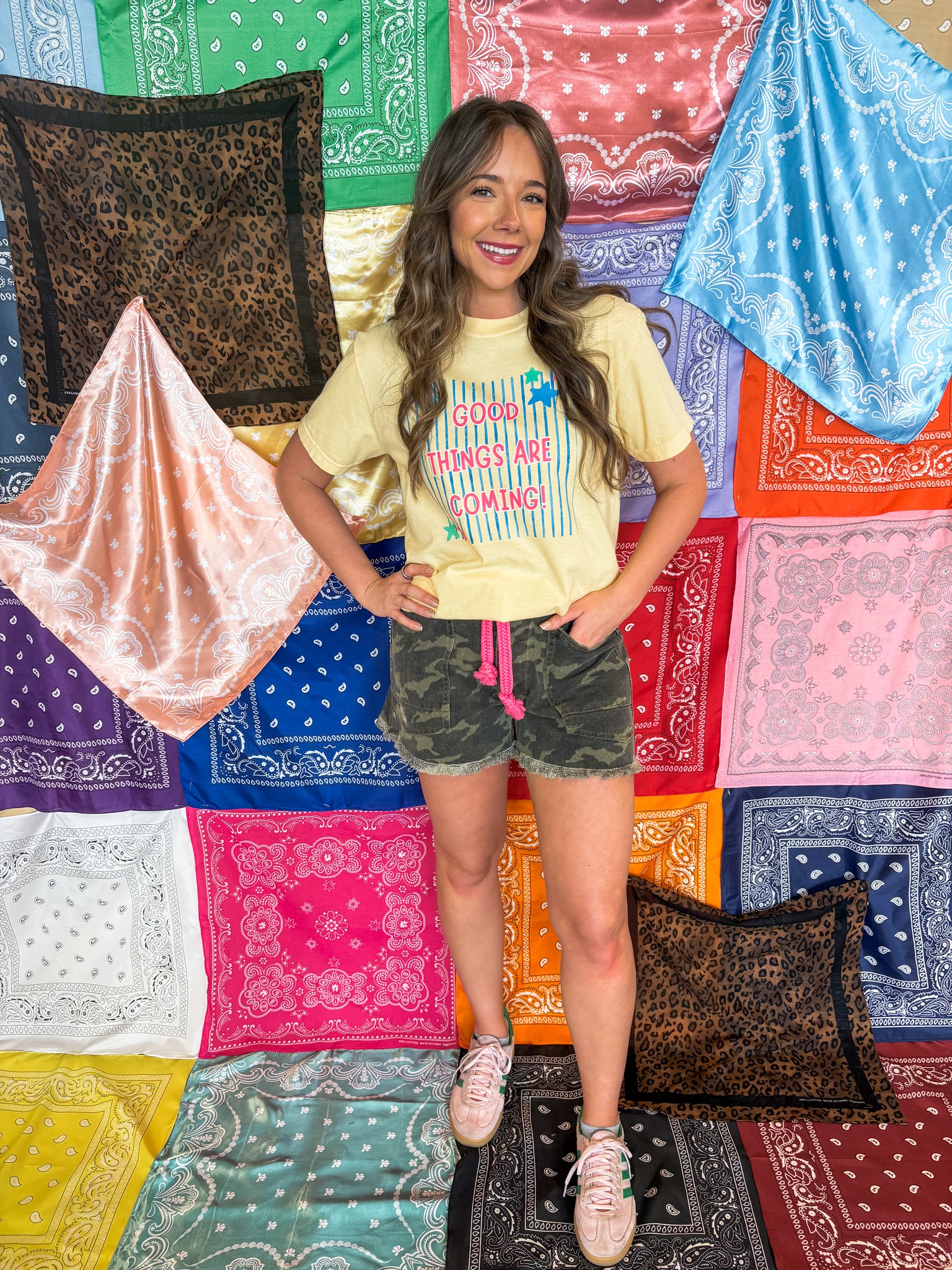 Braided tie waist belt with patch pocket camo print shorts