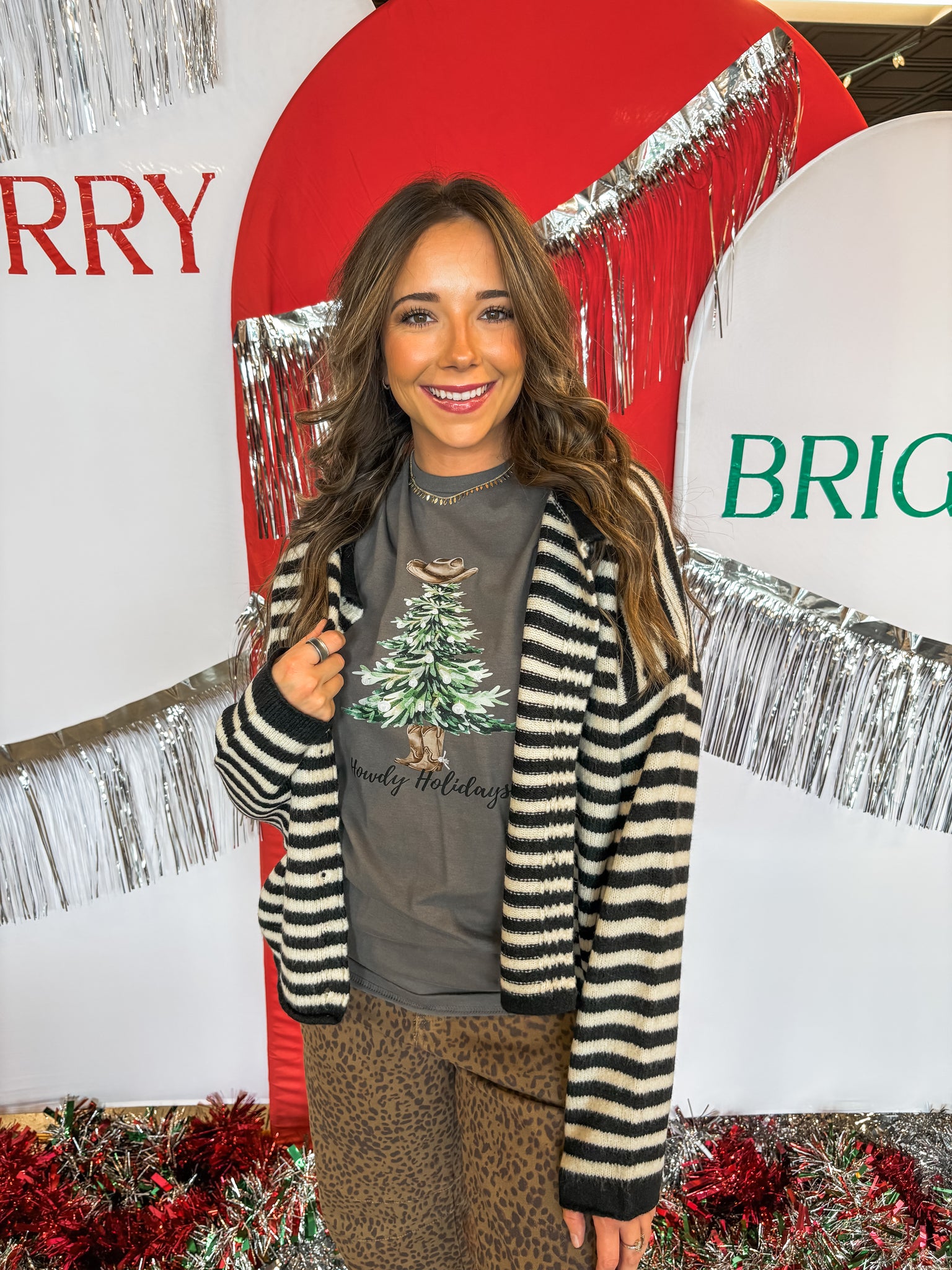 Button up cardigan with stripe detail. Style buttoned up or over your fav graphic!