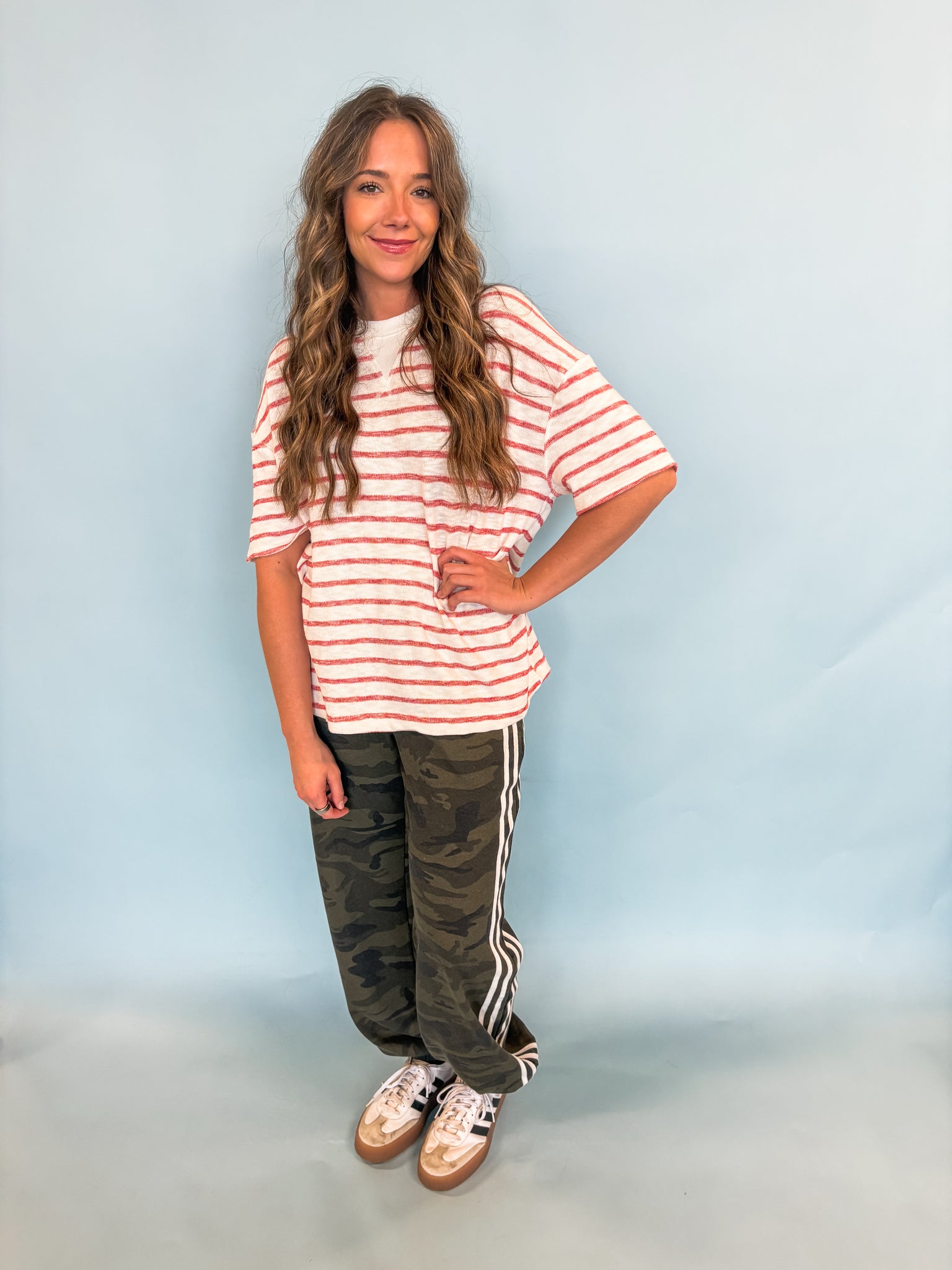 This cotton jersey knit top showcases a subtle texture with its horizontal striping. It features a classic ribbed crew neckline punctuated with a V-stitch insert.