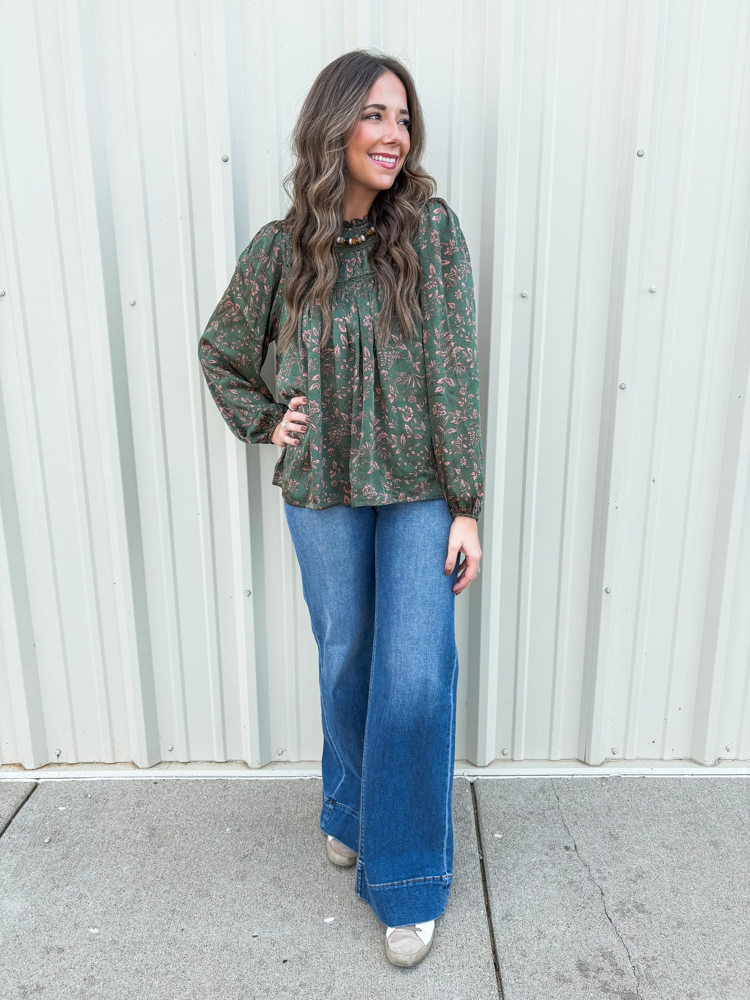 PRINTED CRINKLED SATIN MOCK NECK BLOUSE