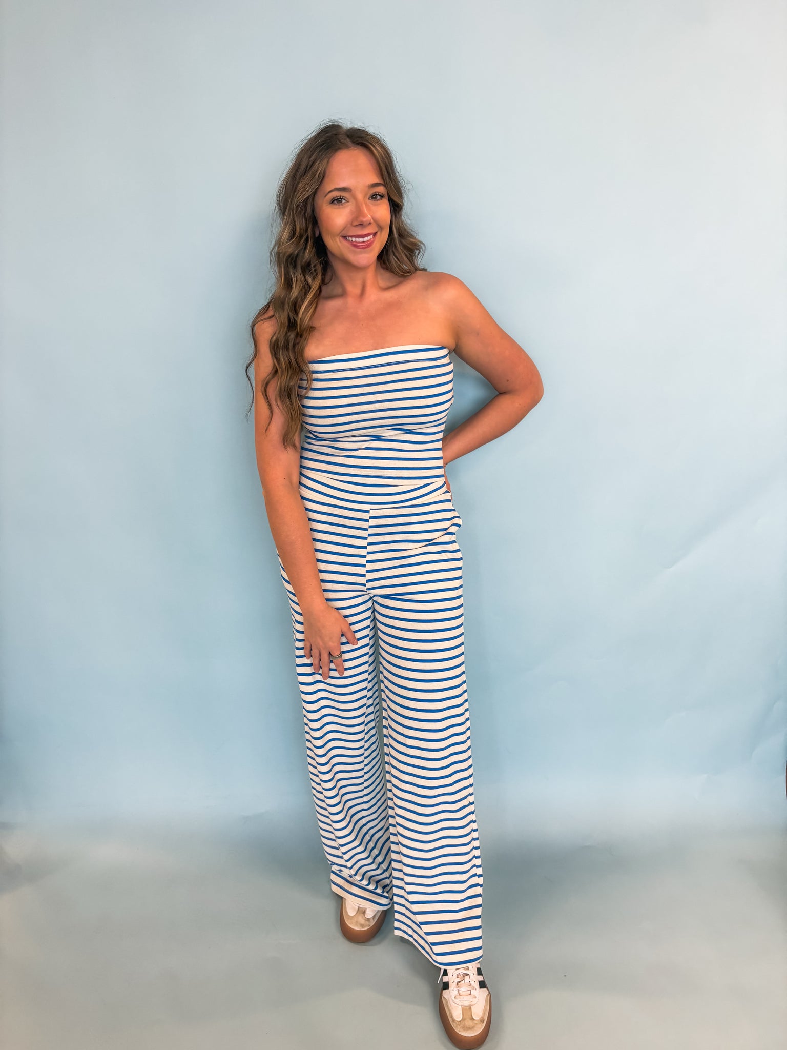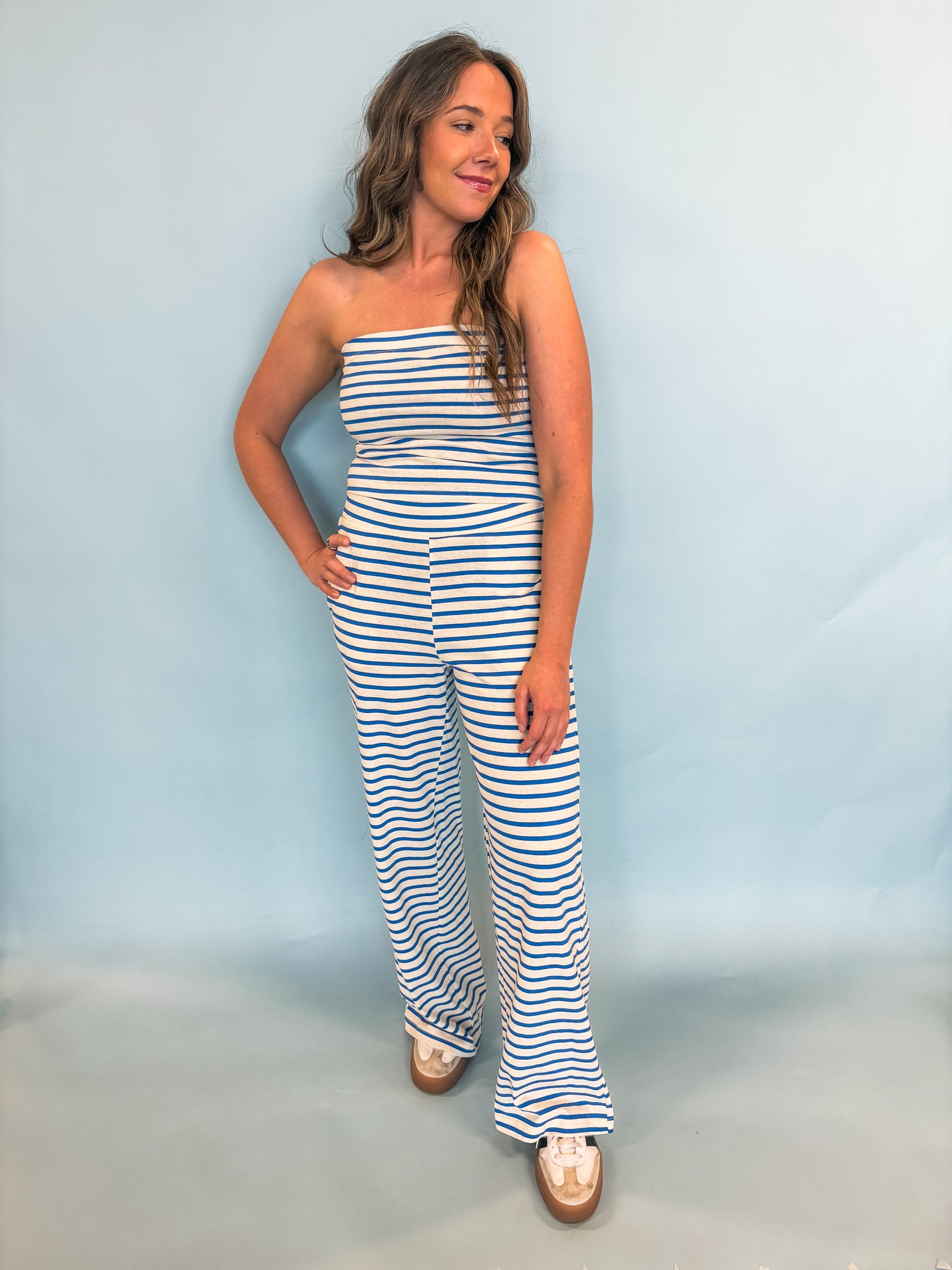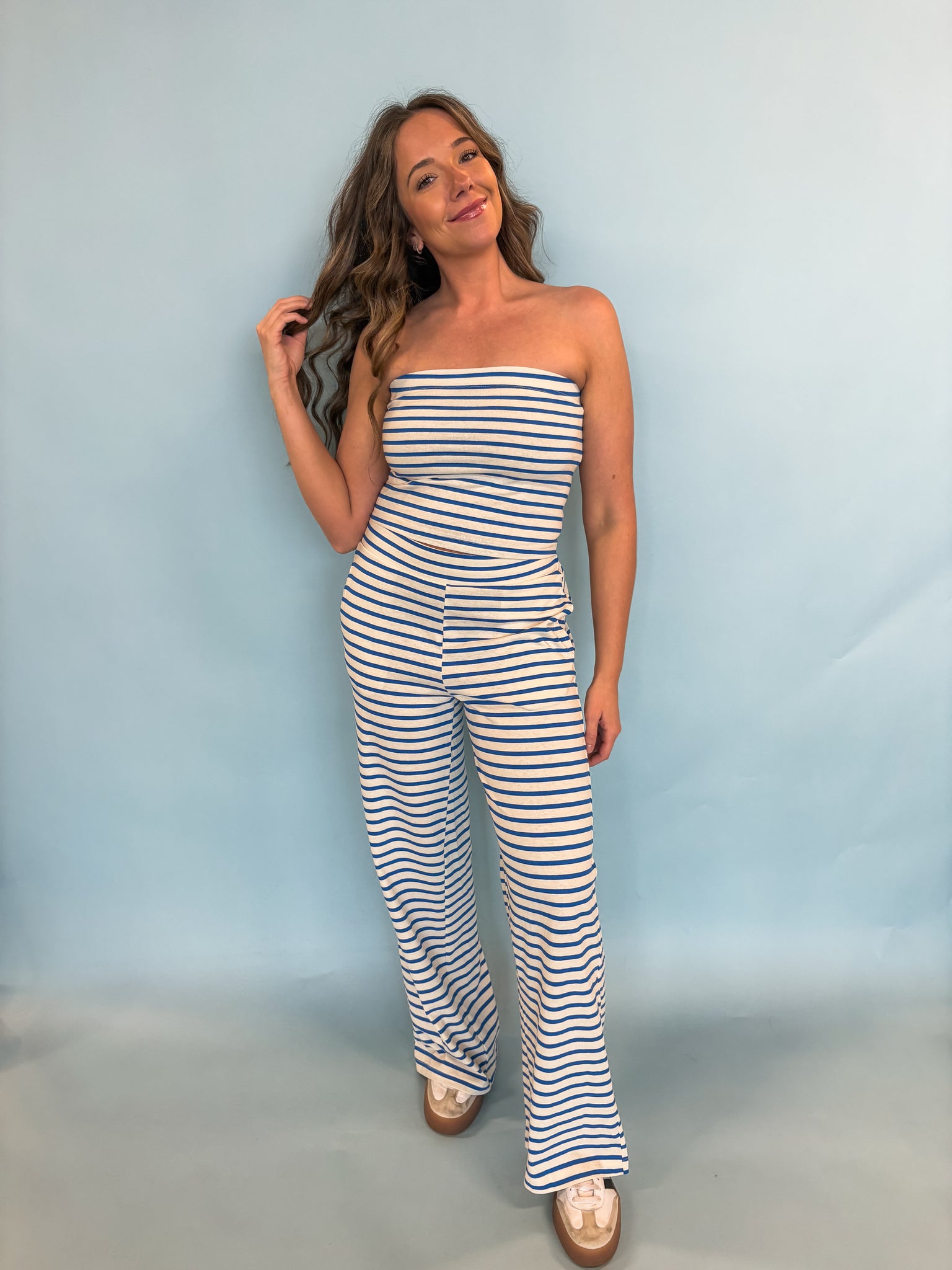 This two-piece set pairs a striped tube top with relaxed pants. The top features a strapless neckline secured by internal elastic and flattering smocking detail at the back. The pants highlight a comfortable elastic waistband and side pockets.