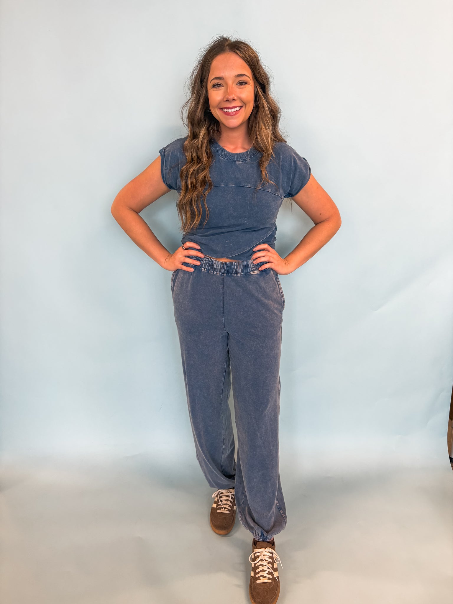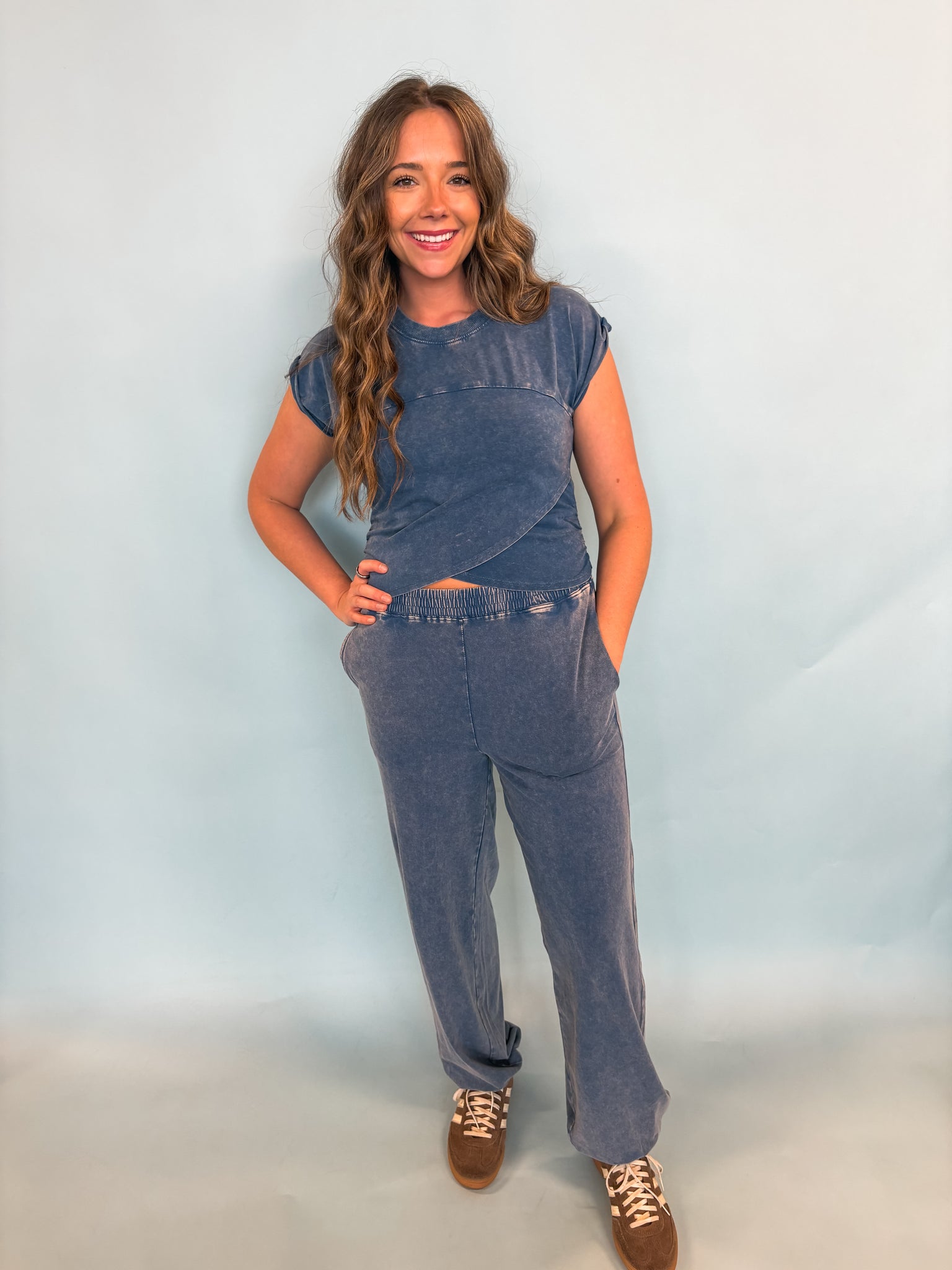 The top includes a classic crew neckline, rolled extended shoulders, and a wrap-front detail. The joggers feature a high-rise elastic waistband, side pockets, and a cinched elastic hem.