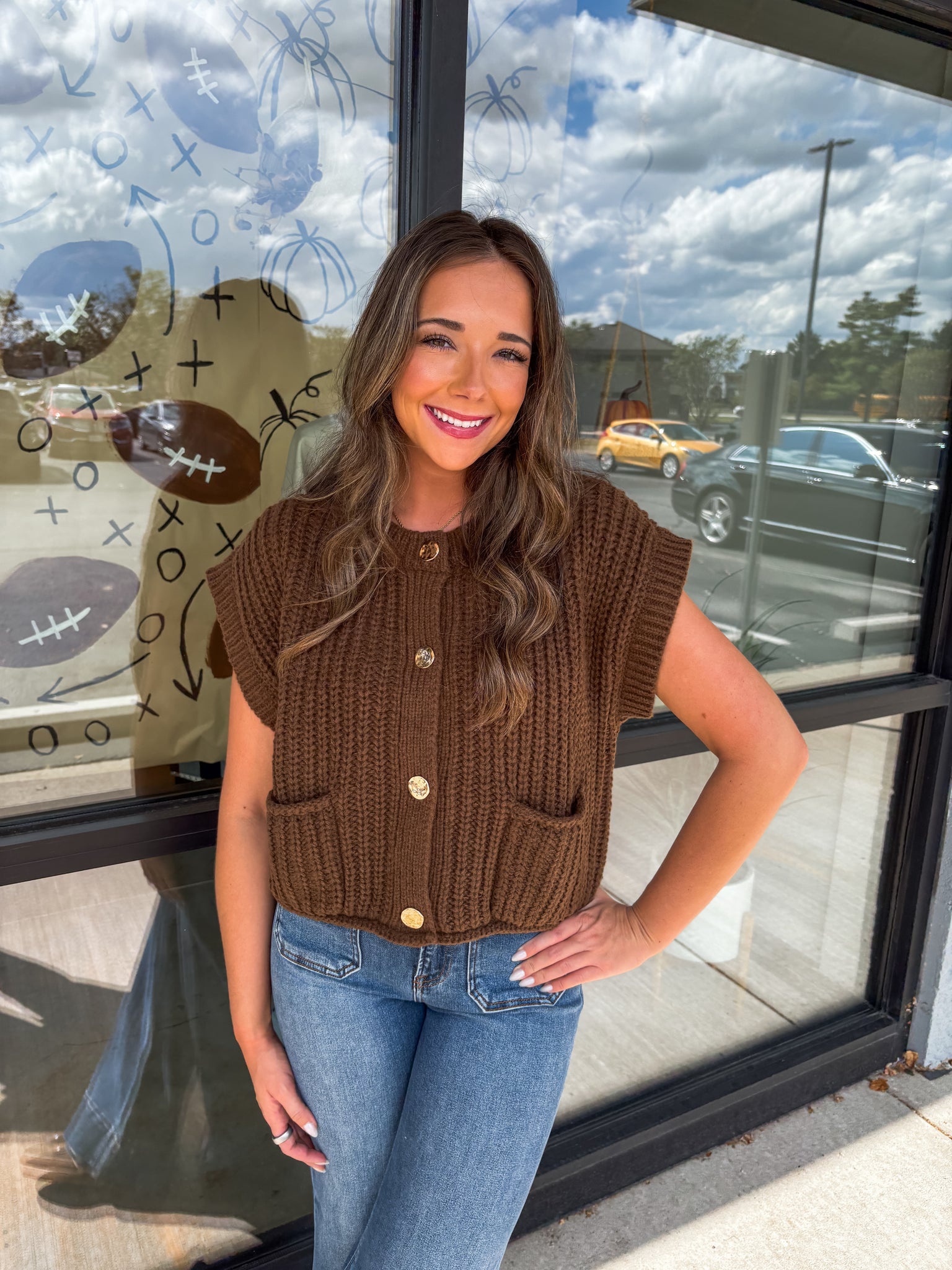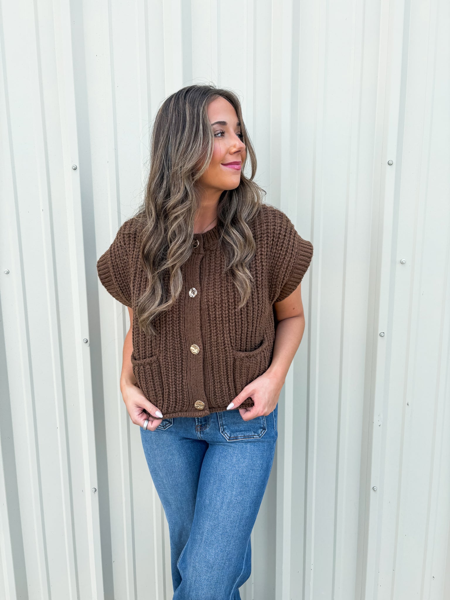 - Oversized Button Down Knit Sweater Top - Round Neck - Short Sleeve - Front Pockets - Ribbed Hem