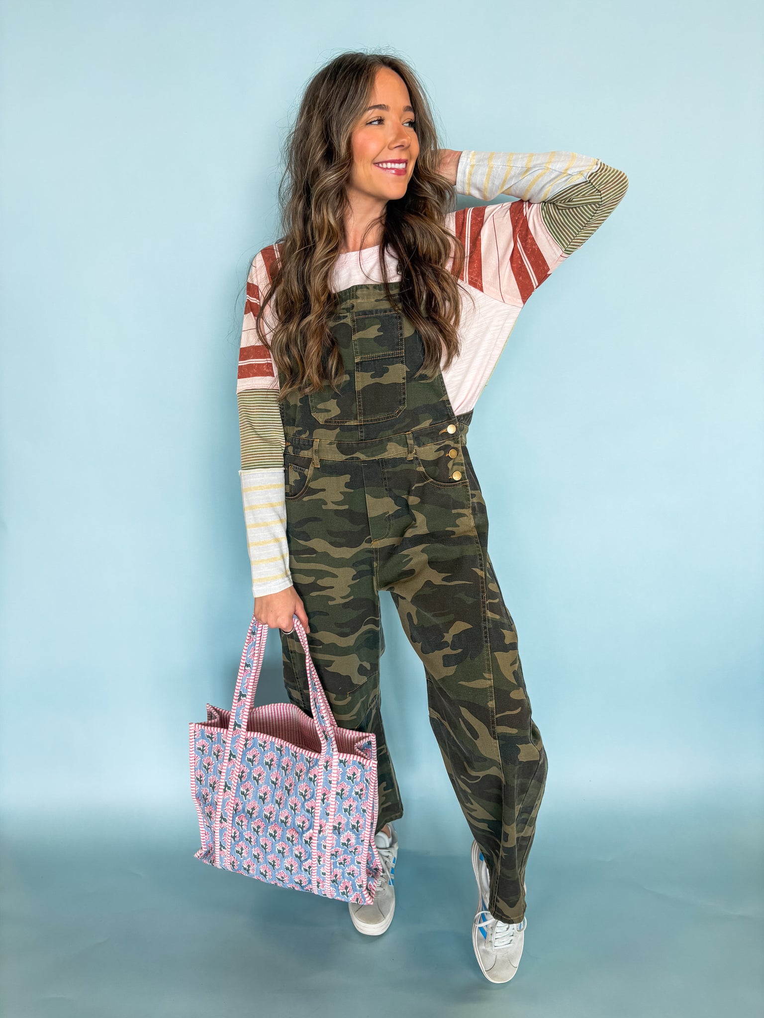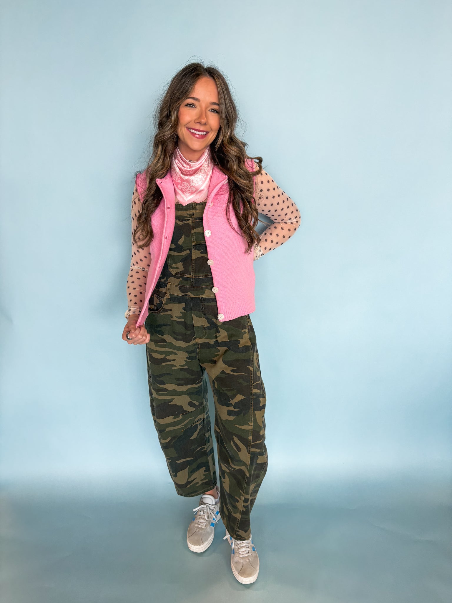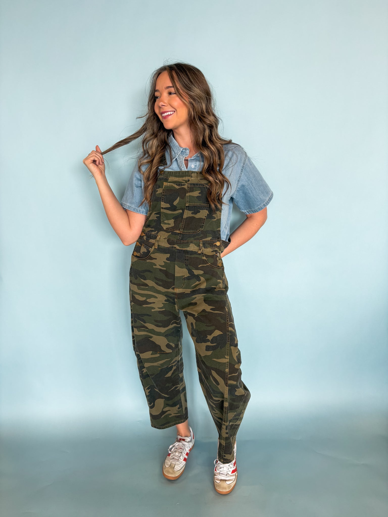 Camo denim barrel pants overall jumpsuit. Adjustable straps. SOOO many fun ways to style!