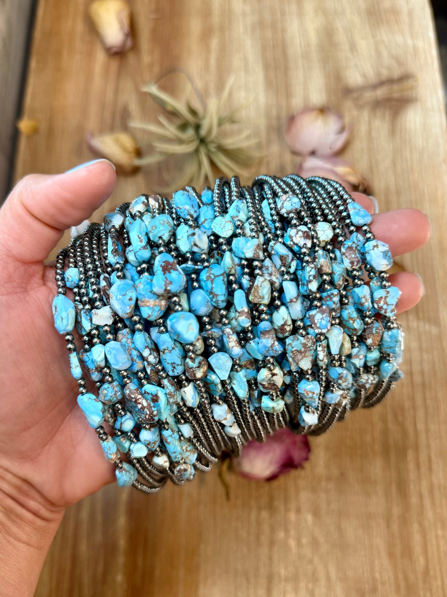 This Golden Hills turquoise necklace features genuine stones sourced directly from the Golden Hills mine, paired with elegant 3 mm sterling silver pearls and a sterling silver chain and lobster clasp. Measuring 16 inches plus a 2-inch extender, each necklace is handmade in the USA and completely unique in stone color and pattern. The soft lavender-blue hues of Golden Hills turquoise make this a stunning and timeless piece — perfect for layering or wearing solo.