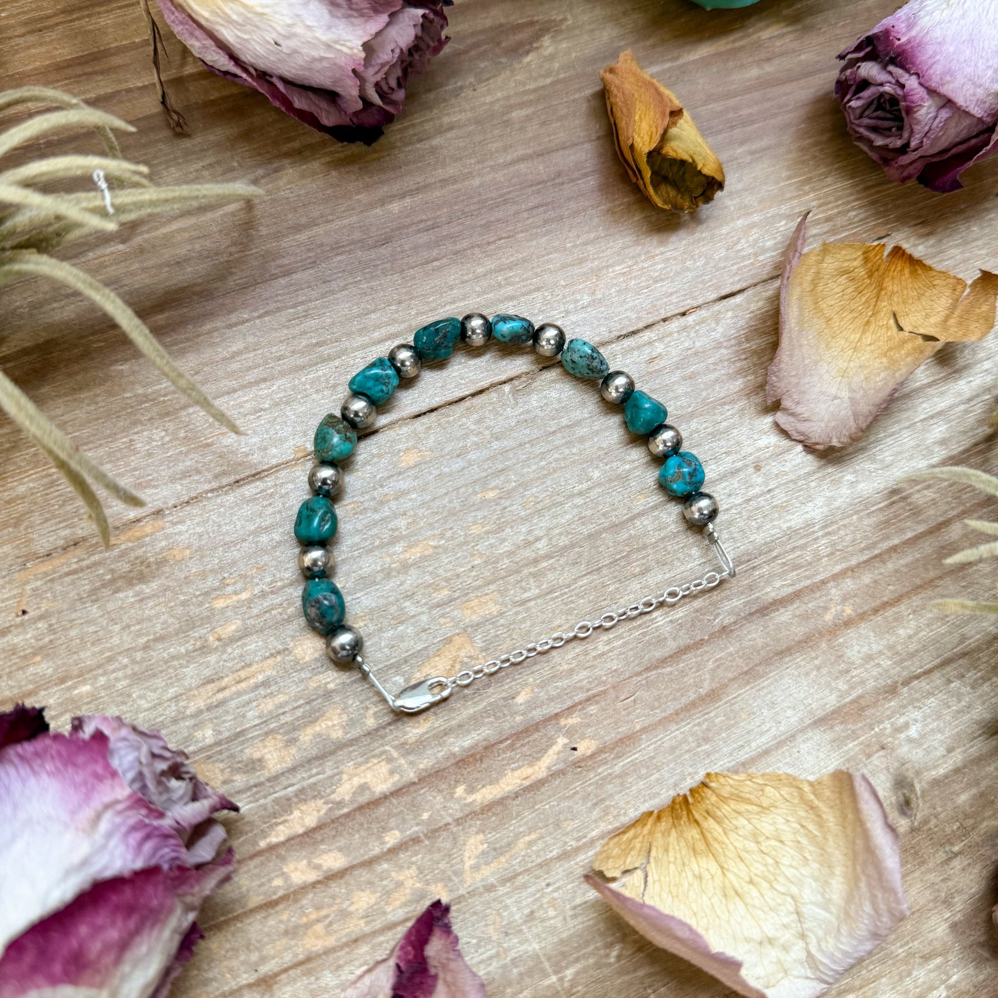 Designed with 6 mm sterling silver pearls paired with natural blue turquoise nuggets, each bracelet has its own unique mix of shapes, tones, and matrix — no two are ever the same.