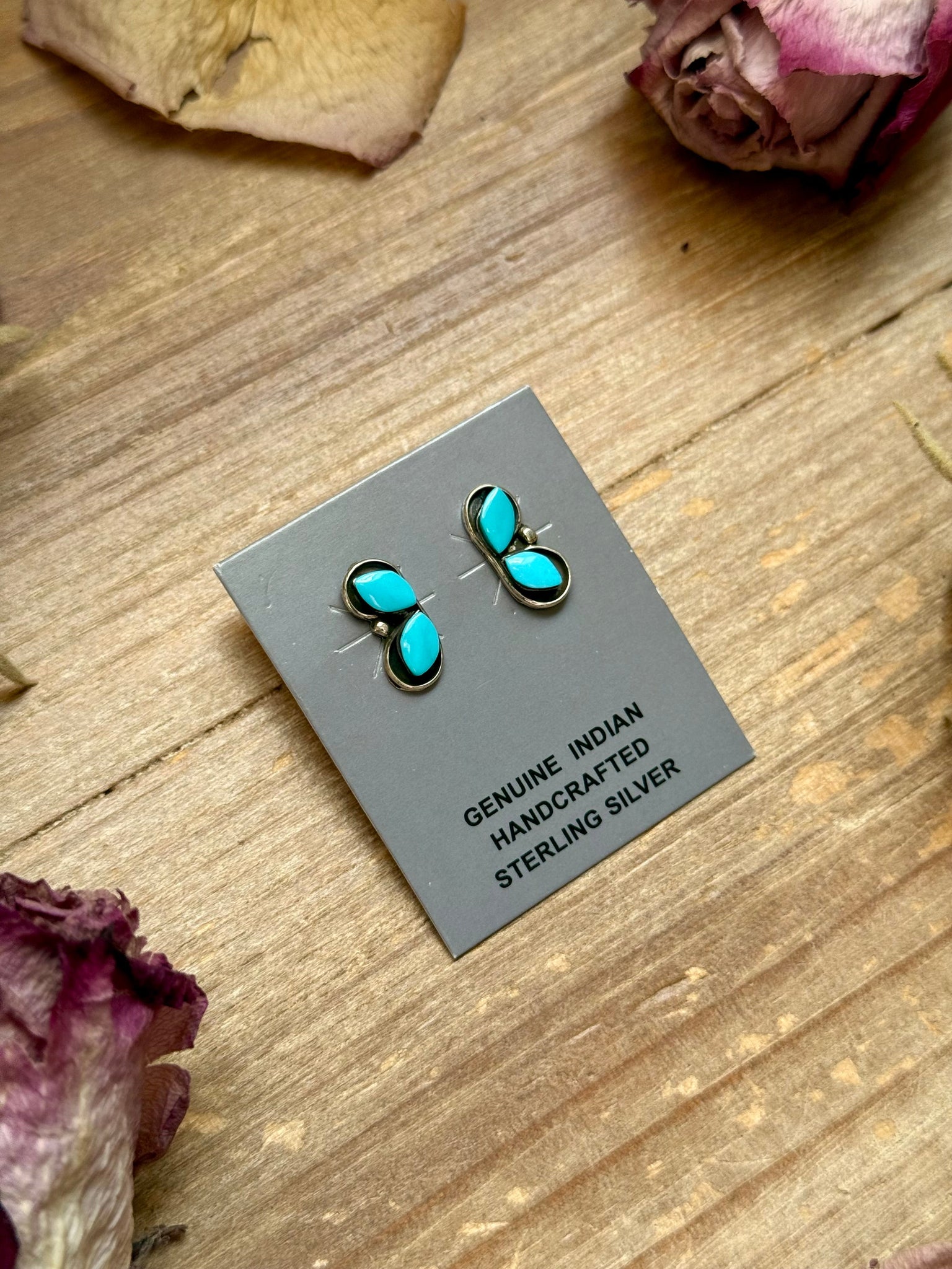These cute little stud earrings are Native made in sterling silver and feature genuine Kingman turquoise stones full of natural character. Designed with a center post, they sit perfectly balanced on the ear and are lightweight enough for everyday wear. Each pair is completely unique, with natural variations in shape, color, and matrix that make every set one of a kind — simple, authentic, and timeless.
