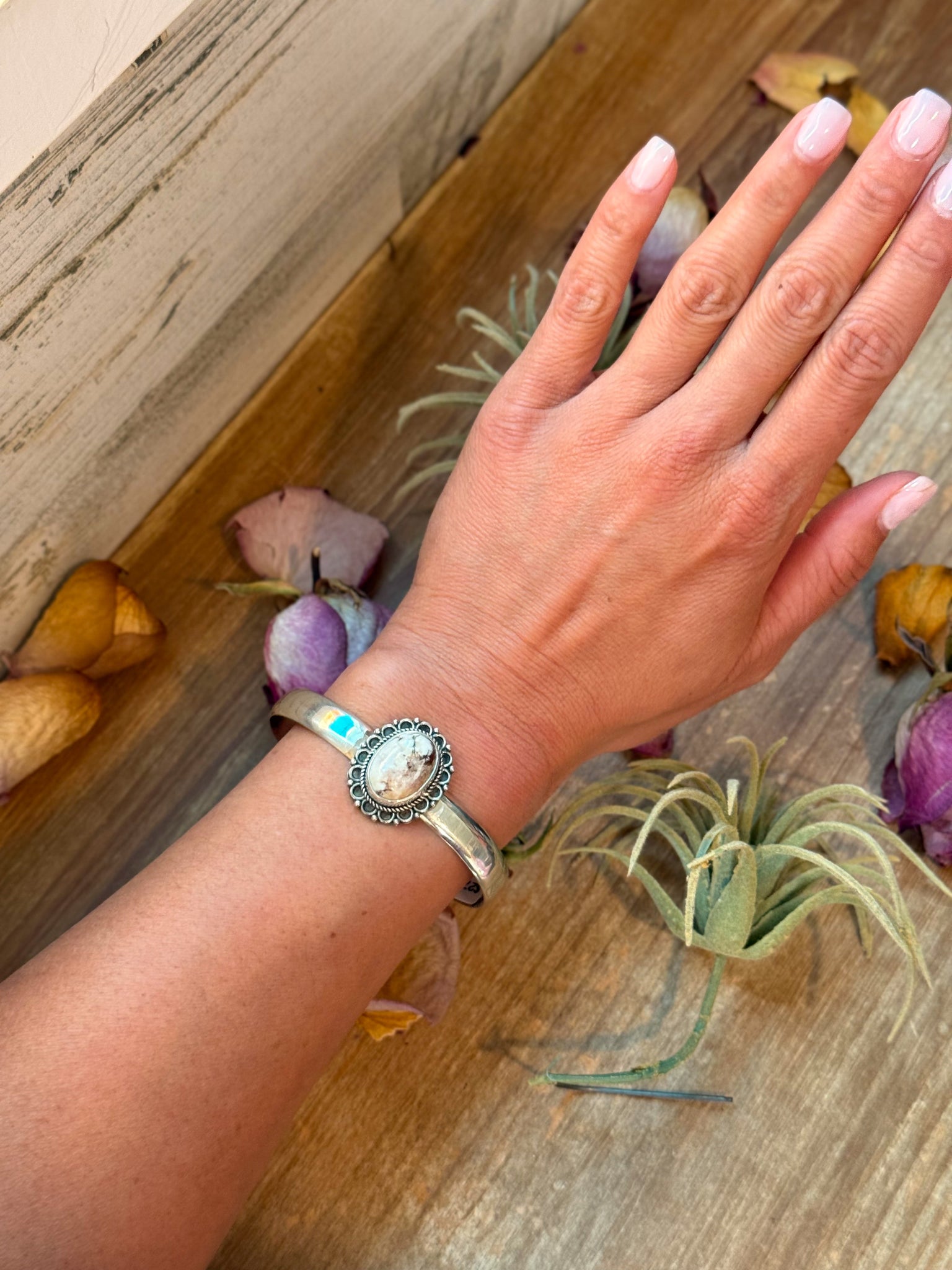 This striking cuff bracelet features genuine Wild Horse stones set in solid sterling silver. Each stone reveals a natural mix of white, brown, and deep maroon tones that make every piece unique. Stamped “Sterling” and proudly handmade in the USA, this cuff offers a slight natural give for a comfortable, adjustable fit. A timeless Southwestern design perfect for layering or wearing solo.